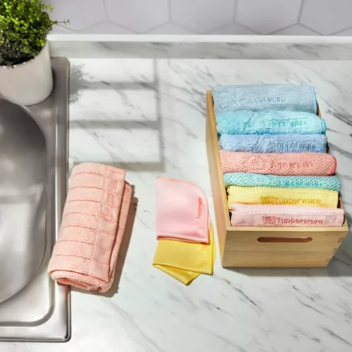Csökkentsd az eldobható papírtörlő használatát. Dobd ki a poros, régi rongyokat. Van egy jobb alternatívánk: Újrahasznosított mikroszálak. A Tupperware új alapanyaga az újrahasznosított poliésztert és a nyers poliamidot ötvözi egy praktikus törlőkendőben, amely felszívja a vizet, zsírt és egyéb szennyeződéseket, és gyakorlatilag bármilyen felületet megtisztít és fényesít. Az újrahasznosított mikroszálak ugyanolyan tisztítóerővel bírnak, mint a nem újrahasznosított anyagból készültek, és élénk színekben pompáznak, minden tisztítási igényt kielégítenek.